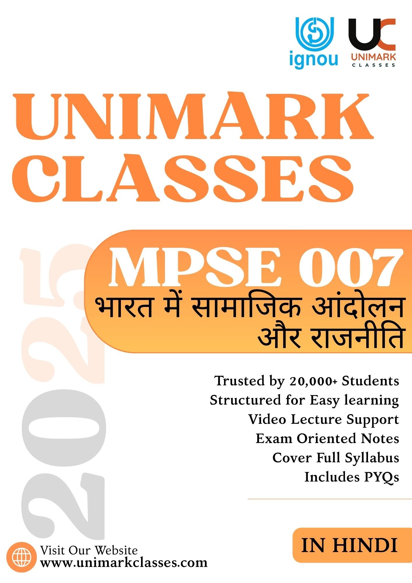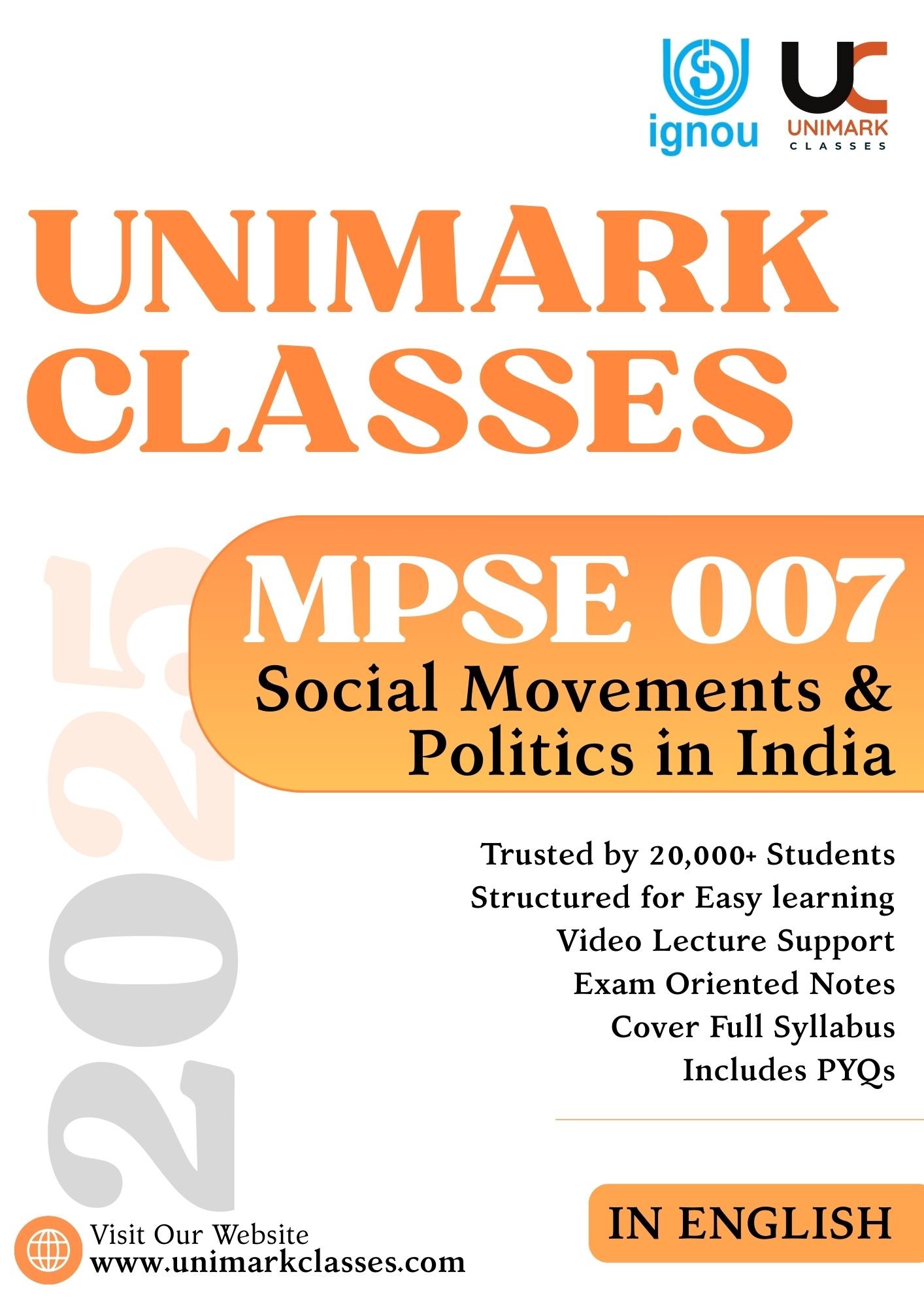Unimark Classes presents the most student-friendly and exam-oriented notes for MPSE 007: Social Movements and Politics in India for IGNOU MA Political Science 2nd Year 2025. These downloadable PDF notes are available in both English and Hindi medium, carefully designed for IGNOU learners who want quick revision, deep understanding, and high marks.
